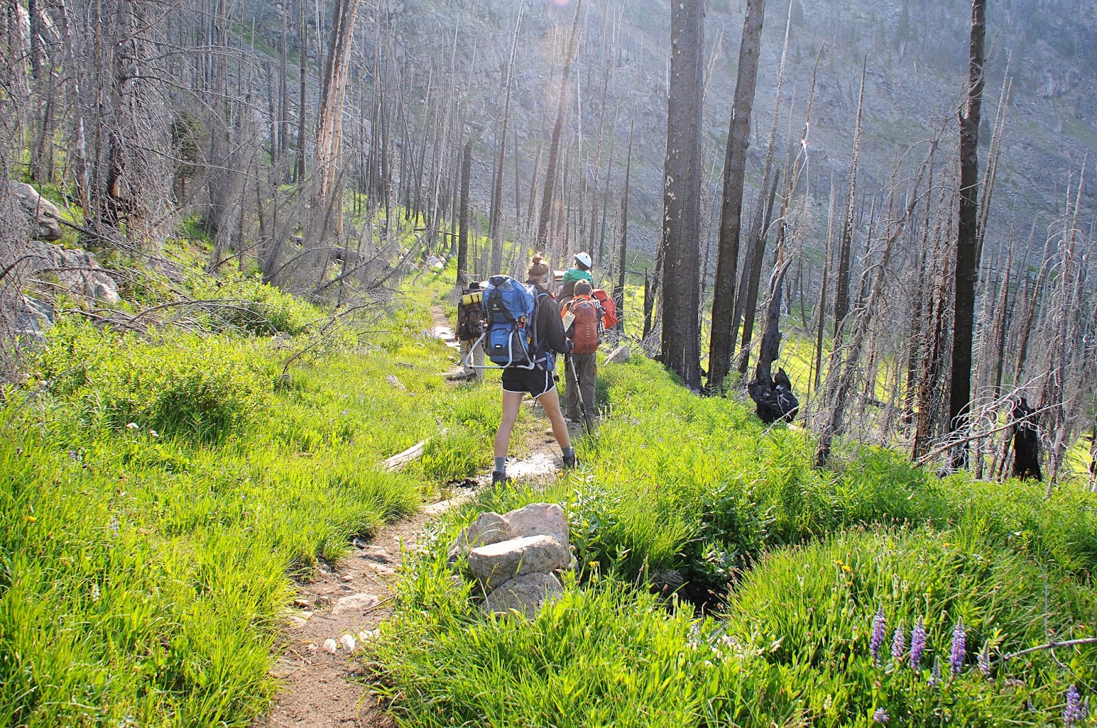 Woke up to beautiful weather once again. Packed up and loaded the horse down and we were on the trail by 7:45 AM. The trail out was so much easier, after we had spent so much time cutting and clearing the trail in on the Middle Fork section. The early morning light on the mountains and flowers was gorgeous. I left camp with fairly nice blisters on my heels, but with the thought of Taco Bell in Omak for lunch they didn't slow me down too much. We made excellent time out, stopped once after we came off the steep section to readjust the saddle and blankets. The little one hiked a couple of the flat miles out, nothing slowed her down, still in good spirits. We made it to the truck and had the horse and all the gear loaded by 1:00 PM. Felt good to change cloths, crawl into the truck and head off the mountain. I would do it all over again, might even hike the same rough, uncleaned Middle Fork Trail. Lots of Aspen groves, I can just imagine the color come fall.